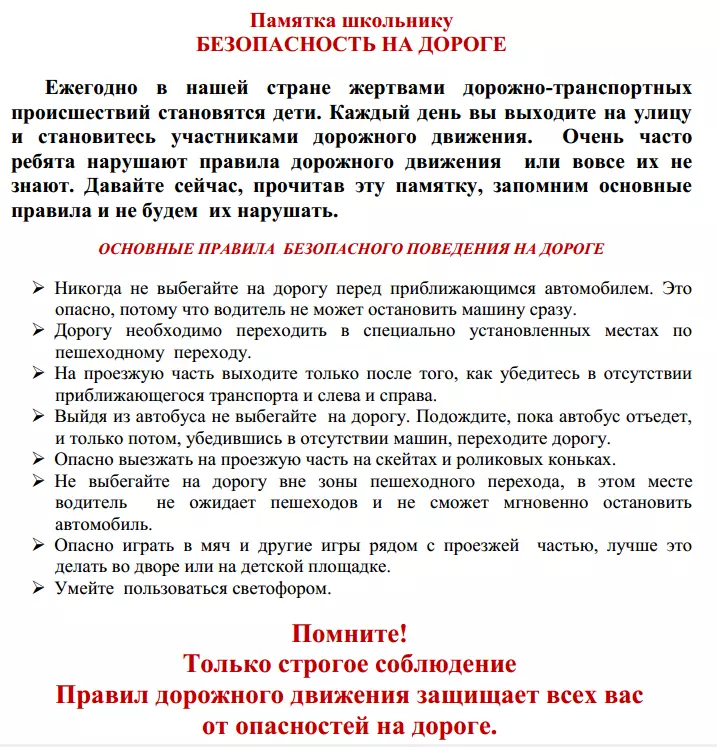 Памятка по правилам дорожного движения и безопасности на дорогах